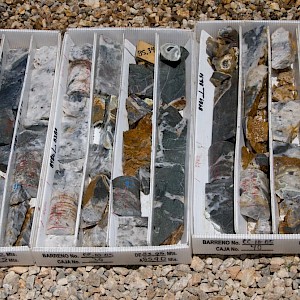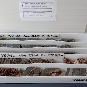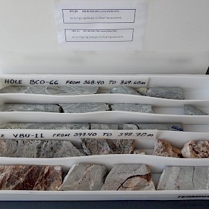 La Bufa quartz vein in core boxes, BCO-35, Coneto property.