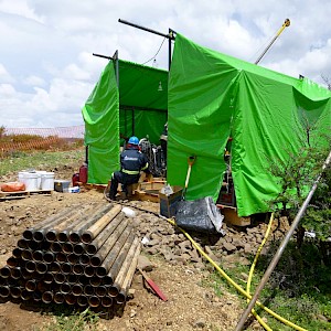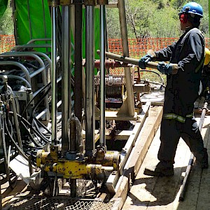 Diamond drillers replacing the core barrel, Coneto property.