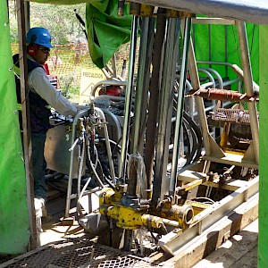 Diamond drillers adjusting the drill head, Coneto property.