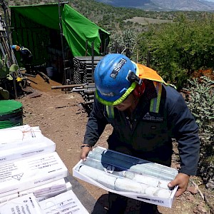Diamond driller stacking the core boxes, Coneto property.