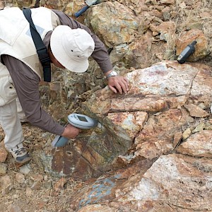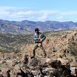 Geologist analysing rock surface on Calaveras Vein, Coneto property.