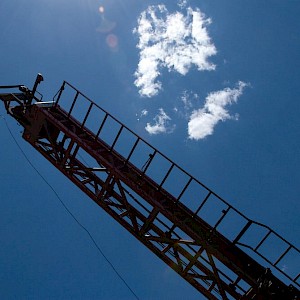Drilling rig headframe against the blue sky, Coneto property.